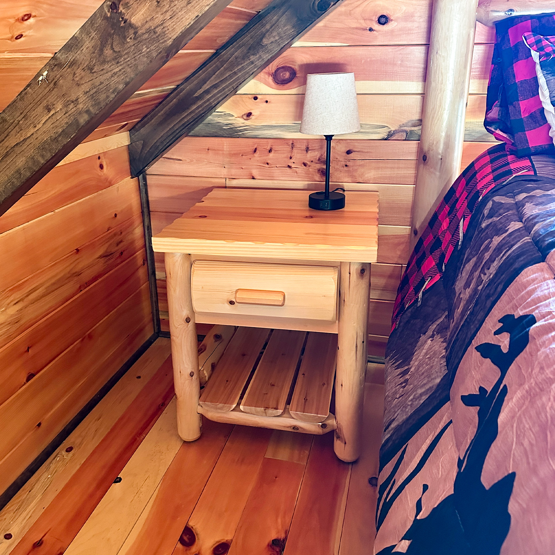 Handcrafted from solid cedar logs, this rustic side table features a drawer and open shelf — a handy and charming addition to any bedroom or living space.
